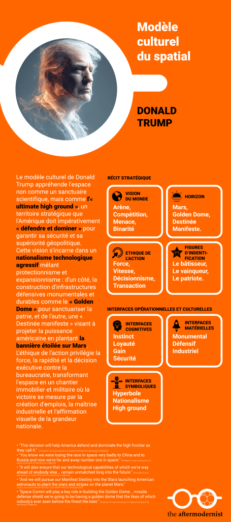 Même au sein de la vision gouvernementale et militaire (Trump, Space Force), l’espace est le lieu où se joue l’avenir de la société américaine : projection de puissance (« Manifest Destiny into the Stars ») et protection du « mode de vie américain ».