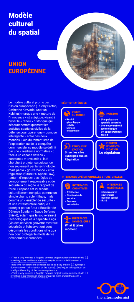 En synthèse : L’Europe a une approche stratégique et instrumentale. Elle pense à ce que l’espace doit être (souverain, compétitif, utile, sécurisé) pour maintenir l’autonomie et la puissance du continent dans le cadre sociétal actuel.