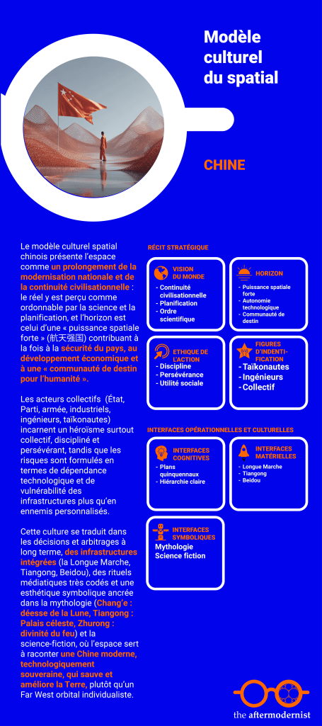 Face à ces deux approches, l’une porteuse d’un modèle culturel, l’autre d’un modèle stratégico-technique, la Chine développe une troisième voie, fondée sur la construction d’une mythologie spatiale dans la continuité de l’évolution civilisationnelle chinoise, au service de l’élévation d’une communauté de peuples, au sein desquelles la Chine joue un rôle centré sur son propre développement. Le spatial incarne un levier symbolique fort du destin chinois.
