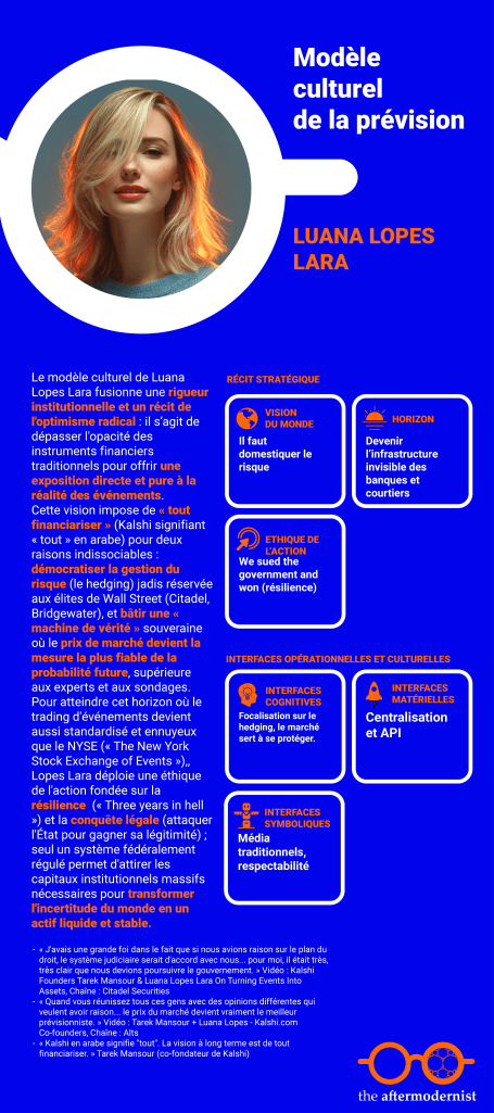 Le marché de la prédiction s’inscrit pleinement dans les modèles culturels dit de Maîtrise et nous reviendrons sur cette catégorie dans un prochain article. En transformant l’incertitude en prix, Kalshi et Polymarket créent des actifs financiers, et dans un monde saturé de récits concurrents, ils offrent un terrain neutre où la vérité a un coût, et donc une valeur.